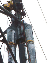 防食テープを巻き付けて腐食部を完全に外気から遮断します。本例ではテープを巻き付けたままの仕上がりですが、この上に塗装することも可能です。この防食テープは既に腐食が進行して塗装が効かない部位に対して特に有効です。